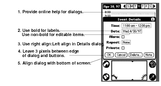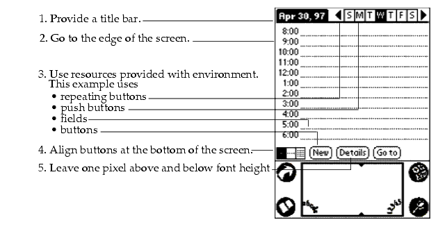 NOTE:  Guidelines for implementing specific user-interface objects, such as information on the size of buttons or the font for labels, is provided in "Palm OS Resources" in the Palm OS SDK Reference. Also see the chapter "User Interface" in this book.