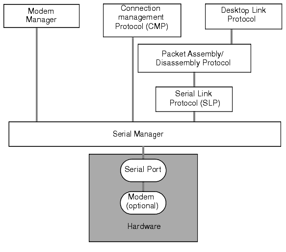 The Palm OS serial manager is responsible for byte-level serial I/O and control of the RS232 signals.