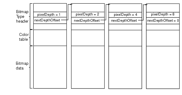 'Tbmp' resource, and the Form Bitmap object that contains it is a 'tFBM' resource.'tbmf' resource, and the PalmRez post linker converts it and its associated PICTs to a 'Tbmp' resource. (Constructor creates PICT format images on both the Macintosh and Microsoft Windows operating systems.)'Tbmp' resource defines either a single bitmap or a bitmap family. A bitmap family is a group of bitmaps, each containing the same drawing but at a different pixel depth (see Figure 5.14). When requested to draw a bitmap family, the operating system chooses the version of the bitmap with the pixel depth equal to the display. If such a bitmap doesn't exist, the bitmap with the pixel depth closest to but less than the display depth is chosen. If there are no bitmaps less than the display depth, then the bitmap with the pixel depth closest to the display depth is used.